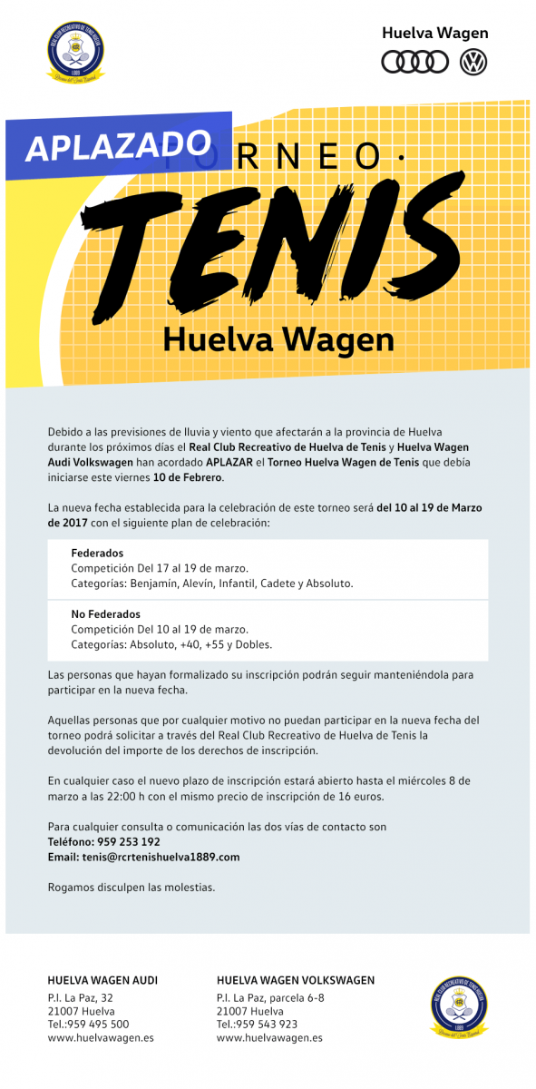 Debido a las previsiones de lluvia y viento que afectarán a la provincia de Huelva desde el viernes hasta el lunes 13 de Febrero el Real Club Recreativo de Huelva de Tenis y Huelva Wagen Audi Volkswagen han acordado aplazar el Torneo Huelva Wagen de Tenis que debía iniciarse el viernes 10 de Febrero.