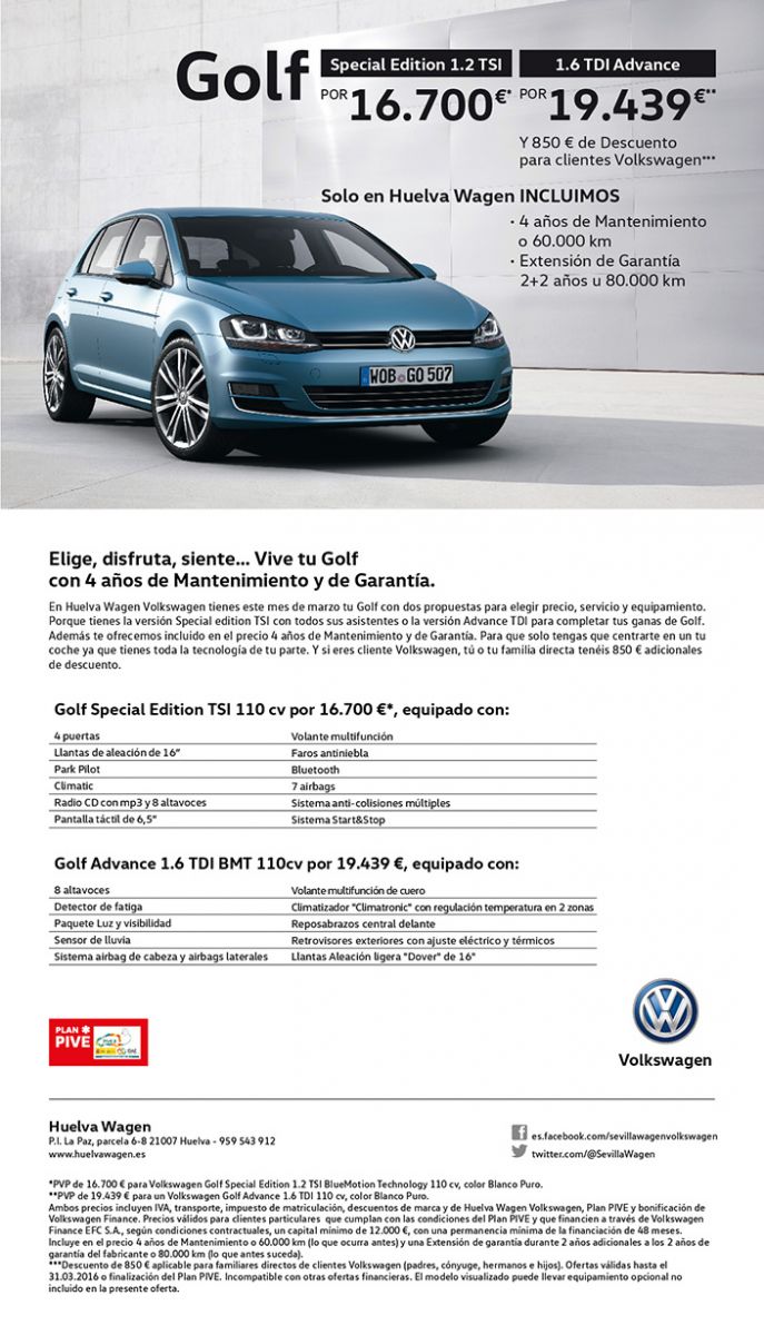Huelva Wagen Volkswagen ha configurado una doble oferta con dos propuestas para elegir precio, servicio y equipamiento. La primera oferta es para el Volkswagen Golf Special Edition 1.2 TSI BlueMotion Technology 110 CV, en color Blanco Puro, que tiene un precio de 16.700 euros. La segunda oferta es para el Volkswagen Golf Advance 1.6 TDI 110cv, también en color Blanco puro, cuyo precio en este caso es de 19.439 euros.